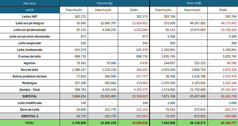 - Tabela 1. Balança comercial de lácteos em setembro de 2025