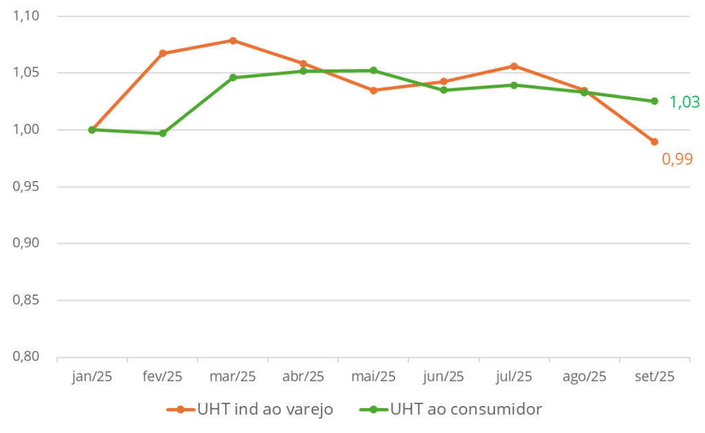 No caso do UHT, o varejo acumula, entre janeiro e setembro de 2025, um aumento de preços ao consumidor de cerca de 3%, enquanto comprou o produto da indústria com preço 1% menor no mesmo período.