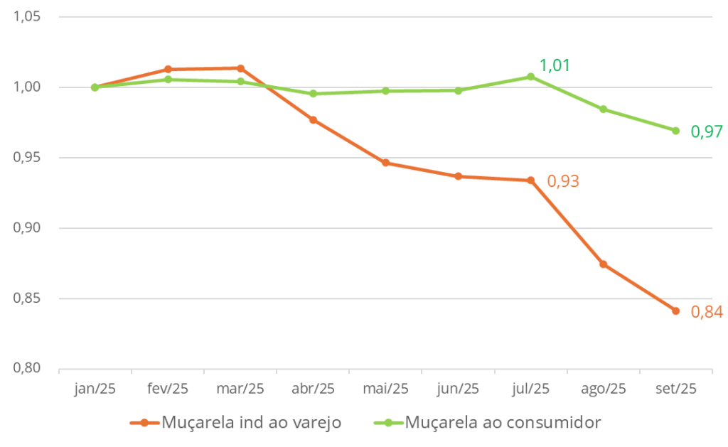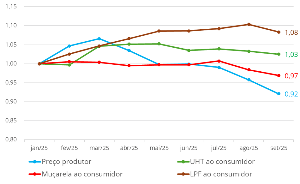 A mesma tendência é observada nas variações de varejo em relação aos preços pagos ao produtor de leite; enquanto o produtor perdeu 8% do seu valor de venda (de acordo com os dados médios Brasil do Cepea) entre janeiro e setembro de 2025, o varejo perdeu apenas 3% no preço ao consumidor da muçarela e teve ganhos no leite UHT e no leite em pó fracionado.